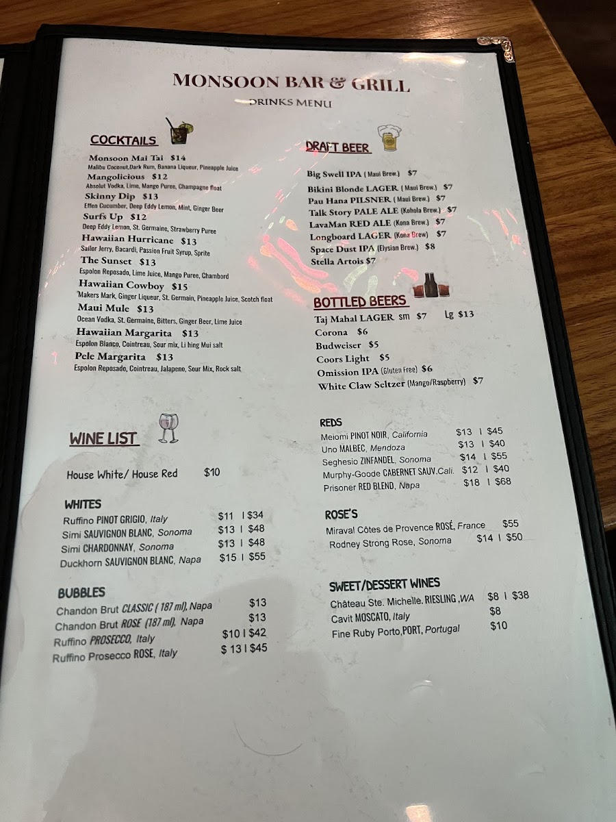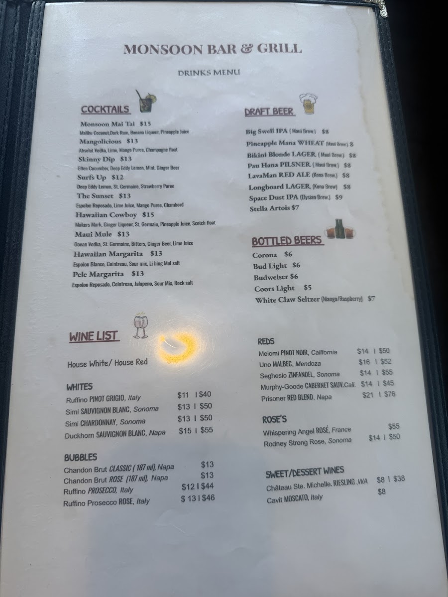 When you visit Monsoon Bar & Grill, you're in for a delightful experience that brings together great food and a laid-back, tropical atmosphere. Nestled at Menehune Shores Resort in Kihei, this spot offers a menu that blends fresh, locally sourced ingredients with bold, island-inspired flavors. Whether you're craving a juicy burger, fresh seafood, or something with a touch of spice, you'll find something to satisfy your taste buds. Monsoon Bar & Grill Menu showcases everything from light bites perfect for a sunset snack to hearty entrees that pair well with their refreshing cocktails. With its relaxed vibe and stunning views, it’s the ideal place to unwind and enjoy a delicious meal with friends or family.